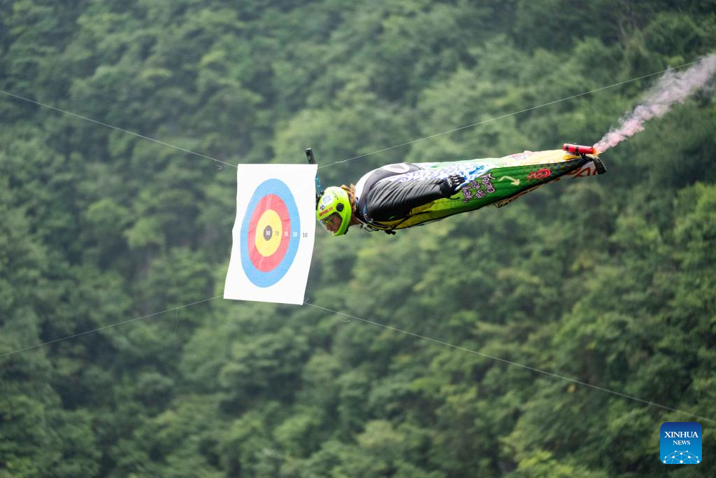 Tahi Munroe of Australia competes during the flying through targets competition at the 10th World Wingsuit League (WWL) Wingsuit Flying World Championship at the Tianmen Mountain National Forest Park in Zhangjiajie, central China's Hunan Province, on Sept. 19, 2024. (Xinhua/Chen Sihan)