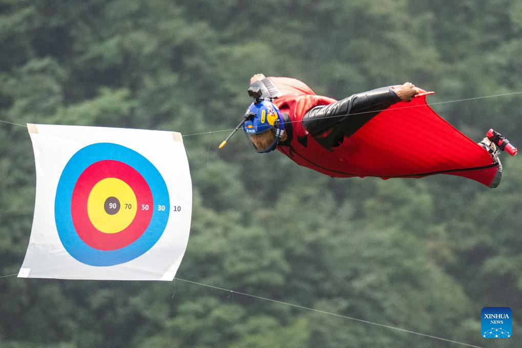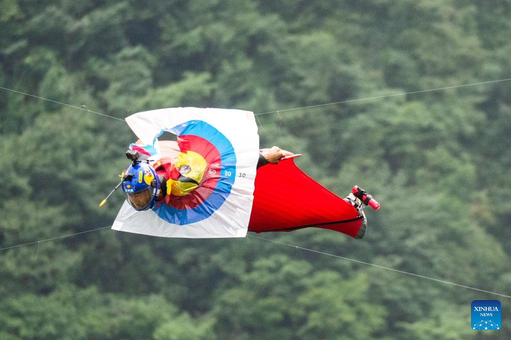 Zhang Shupeng of China competes during the flying through targets competition at the 10th World Wingsuit League (WWL) Wingsuit Flying World Championship at the Tianmen Mountain National Forest Park in Zhangjiajie, central China's Hunan Province, on Sept. 19, 2024. (Xinhua/Chen Sihan)