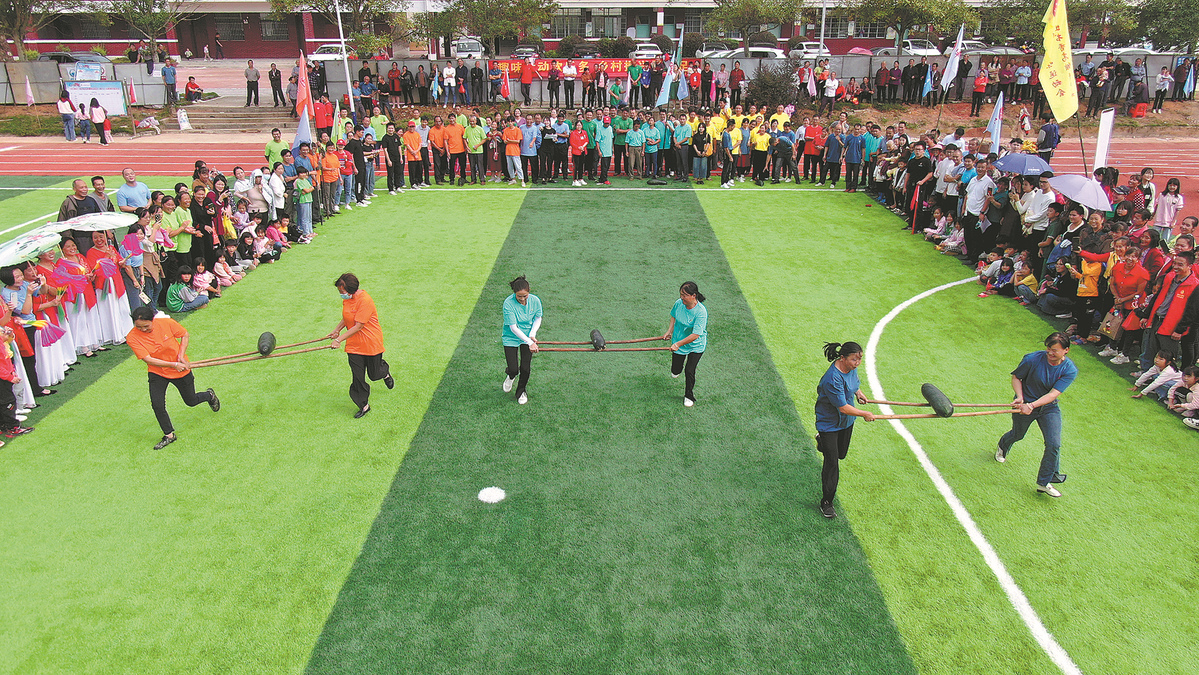 Villagers participate in a sports event featuring fun activities in Huichang on Oct 14. (LIU ZHAOCHUN/CHINA DAILY)