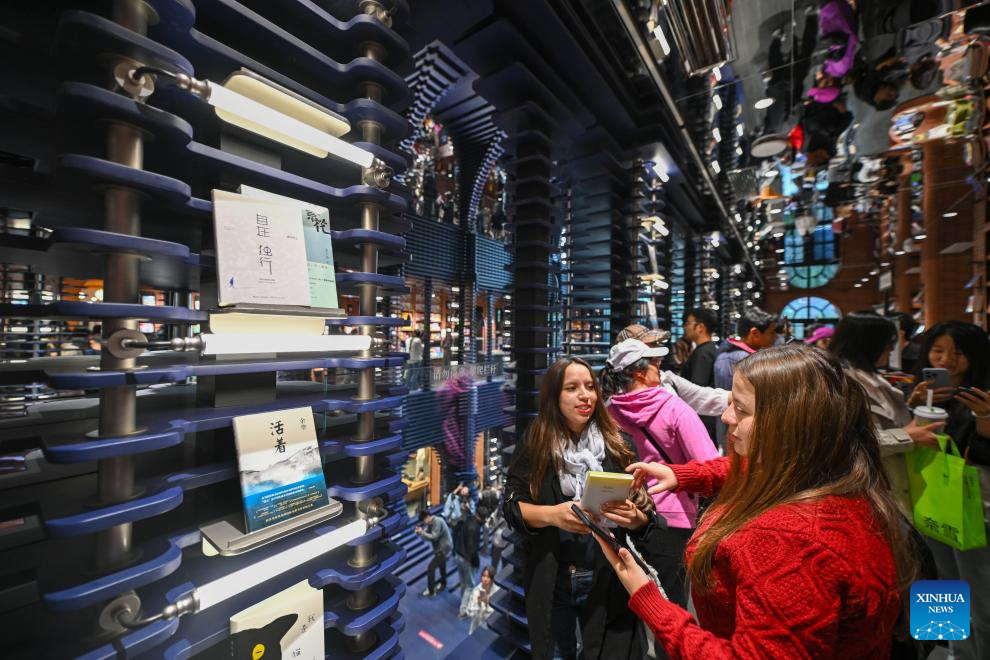 Readers select books at Zhongshuge Bookstore in the Italian Style Area in Tianjin, north China, Oct. 2, 2024. Zhongshuge Bookstore, an urban renewal and upgrading project of Tianjin, attracts many tourists during the National Day holiday. It will serve citizens with various cultural activities to promote reading in the future. (Xinhua/Sun Fanyue)
