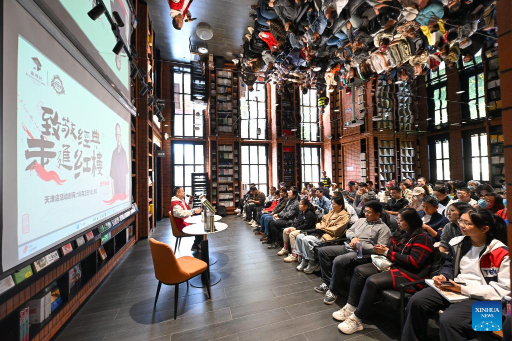 Readers attend a book-reading session at Zhongshuge Bookstore in the Italian Style Area in Tianjin, north China, Oct. 2, 2024. Zhongshuge Bookstore, an urban renewal and upgrading project of Tianjin, attracts many tourists during the National Day holiday. It will serve citizens with various cultural activities to promote reading in the future. (Xinhua/Sun Fanyue)