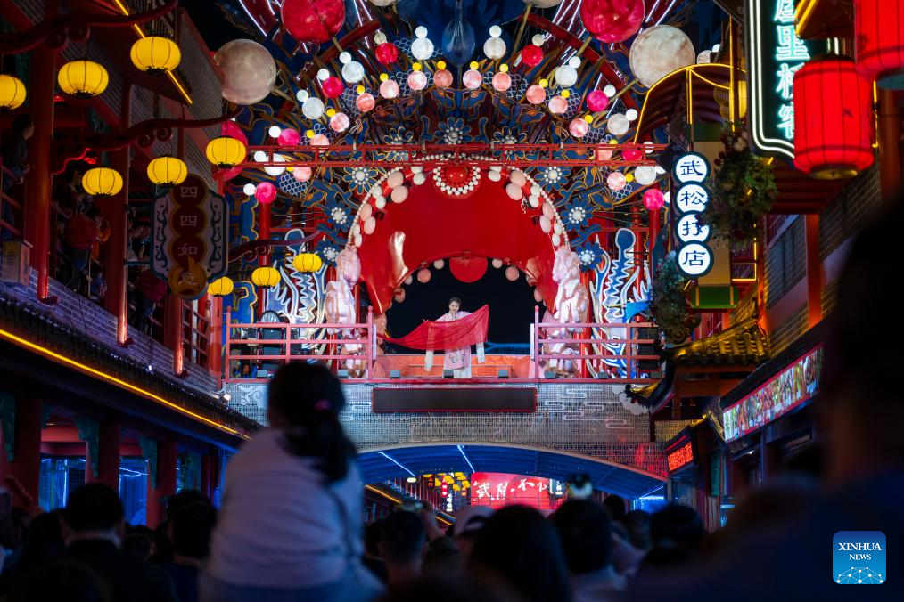 People watch a performance at a tourist attraction in Zhuxi County of Shiyan City, central China's Hubei Province, Oct. 12, 2024. (Xinhua/Wu Zhizun)