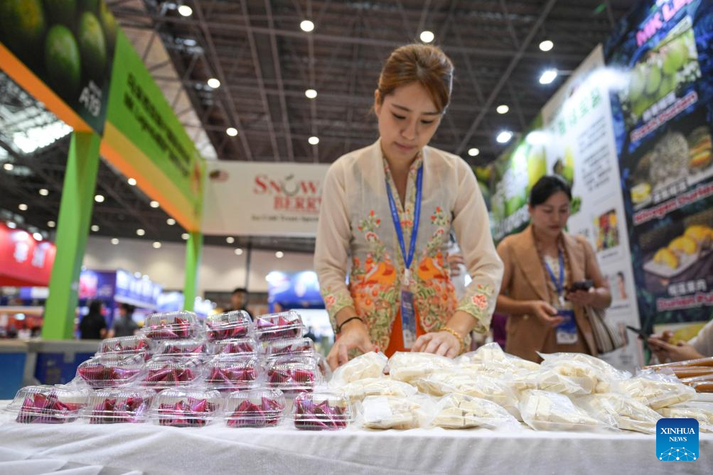 A staff member arranges food from Malaysia during the 2nd Hainan International Tropical Food Supply Chain Expo in Haikou, south China's Hainan Province, Oct. 17, 2024. The 2nd Hainan International Tropical Food Supply Chain Expo kicked off here Thursday. (Xinhua/Pu Xiaoxu)