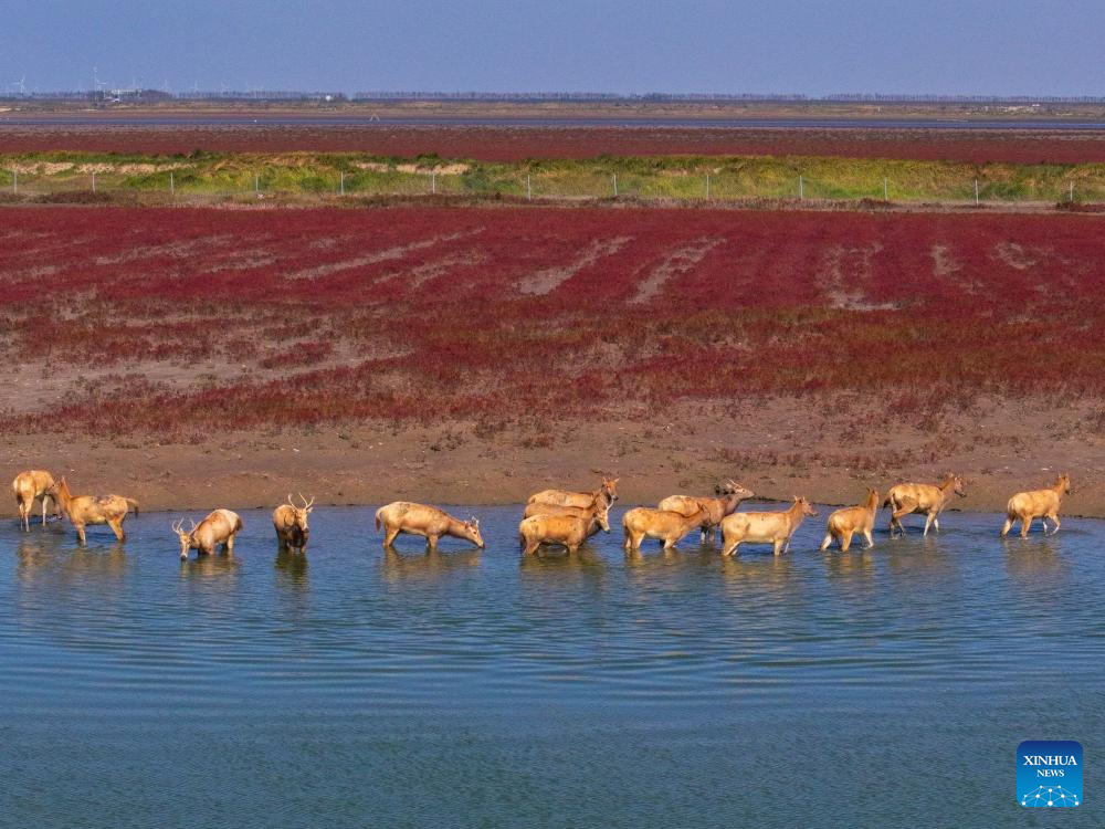 An aerial drone photo taken on Oct. 29, 2024 shows elks at Tiaozini wetland in Dongtai of Yancheng City, east China's Jiangsu Province. (Xinhua/Deng Hua)