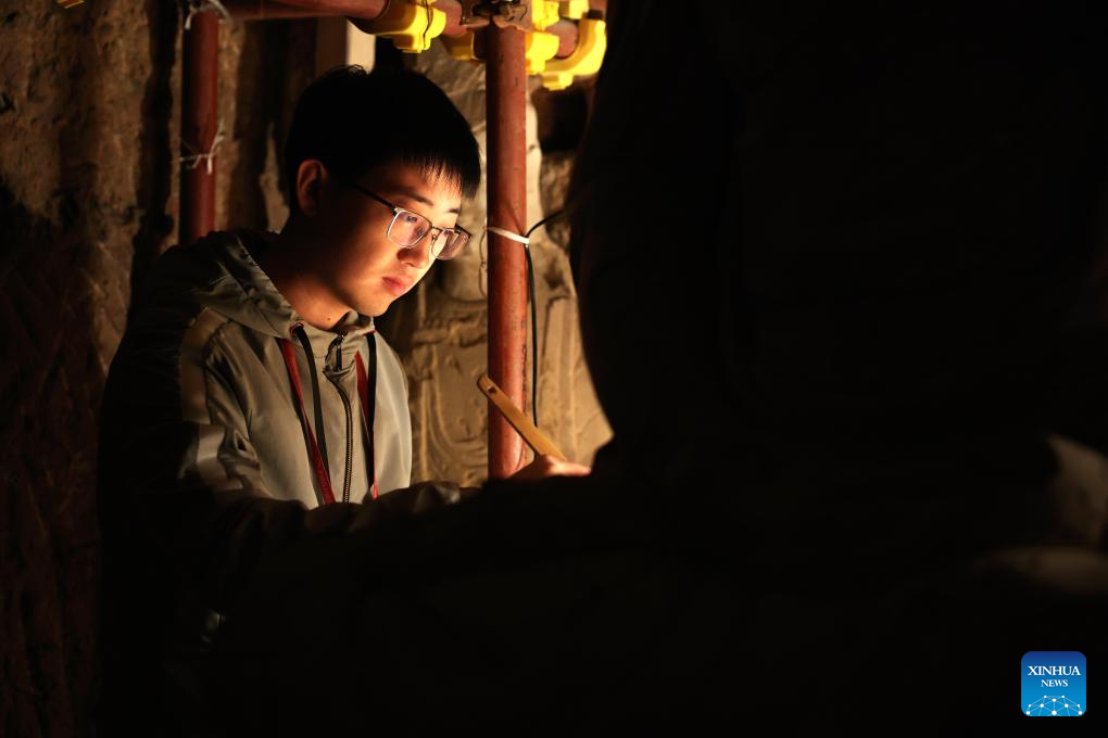 Dong Guangqiang, director of the digital center of Maiji Mountain Grottoes art institute, checks the mural sculptures at the Maiji Mountain Grottoes in Maiji District of Tianshui City, northwest China's Gansu Province on Nov. 2, 2024. The Maiji Mountain Grottoes is one of the four most famous grottoes in China. In the past three years, 29 caves here have been protected and reinforced as Maiji Mountain Grottoes art institute and other cultural relics protection organizations have employed scientific and technological methods to ensure the grottoes remain well-preserved. (Xinhua/Chen Bin)