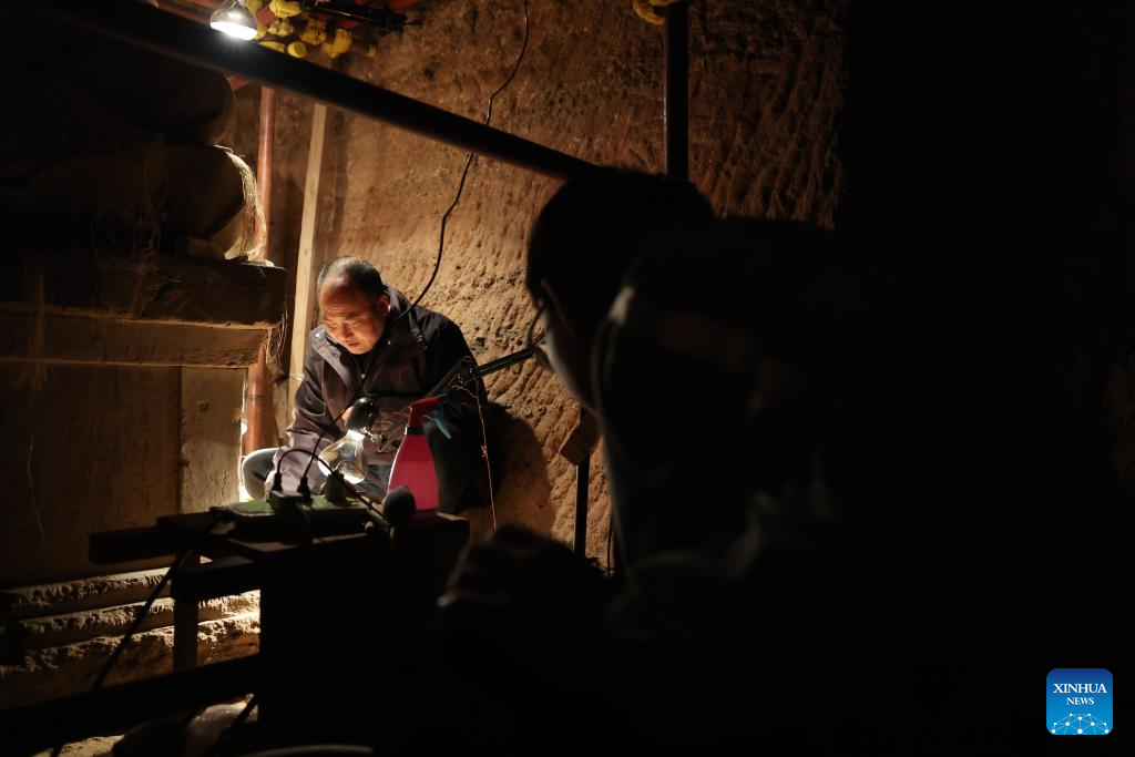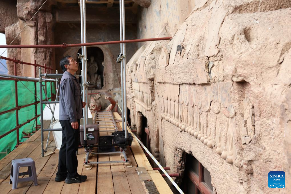 Mu Changyou, a cultural relics restorer of Maiji Mountain Grottoes art institute, carries out protection and restoration work at a cave of the Maiji Mountain Grottoes in Maiji District of Tianshui City, northwest China's Gansu Province on Nov. 2, 2024. The Maiji Mountain Grottoes is one of the four most famous grottoes in China. In the past three years, 29 caves here have been protected and reinforced as Maiji Mountain Grottoes art institute and other cultural relics protection organizations have employed scientific and technological methods to ensure the grottoes remain well-preserved. (Xinhua/Chen Bin)