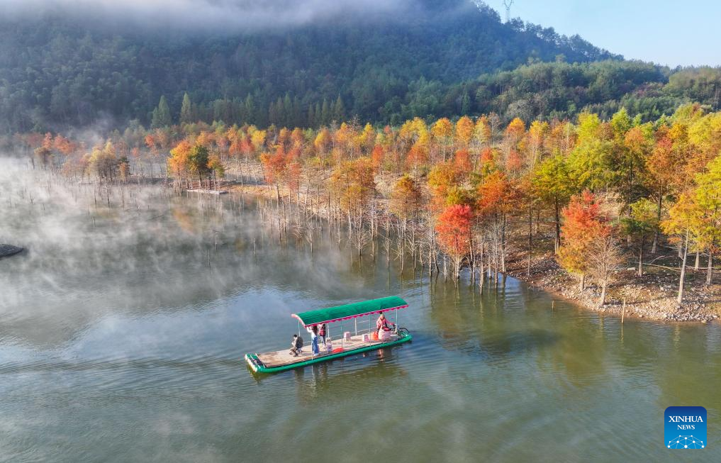 An aerial drone photo taken on Nov. 7, 2024 shows tourists viewing bald cypress forests on a sightseeing raft at a wetland park in Fangtang Township of Ningguo City, east China's Anhui Province. (Xinhua/Chen Yehua)