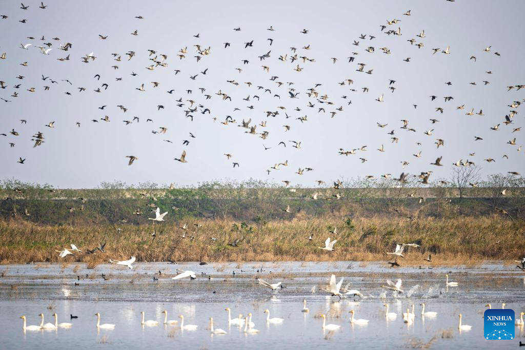Migrant birds are seen at Chongming Dongtan National Nature Reserve in east China's Shanghai, Nov. 12, 2024. A large number of migrant birds winter at the reserve. (Xinhua/Li Bo)