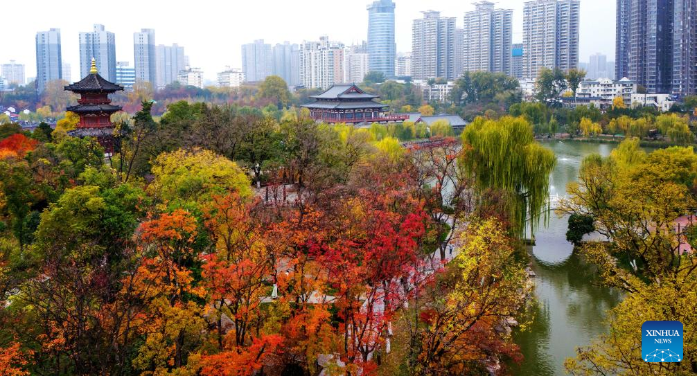 An aerial drone photo taken on Nov. 14, 2024 shows the scenery at the Xingqing Palace Park in Xi'an, northwest China's Shaanxi Province. (Xinhua/Zou Jingyi)