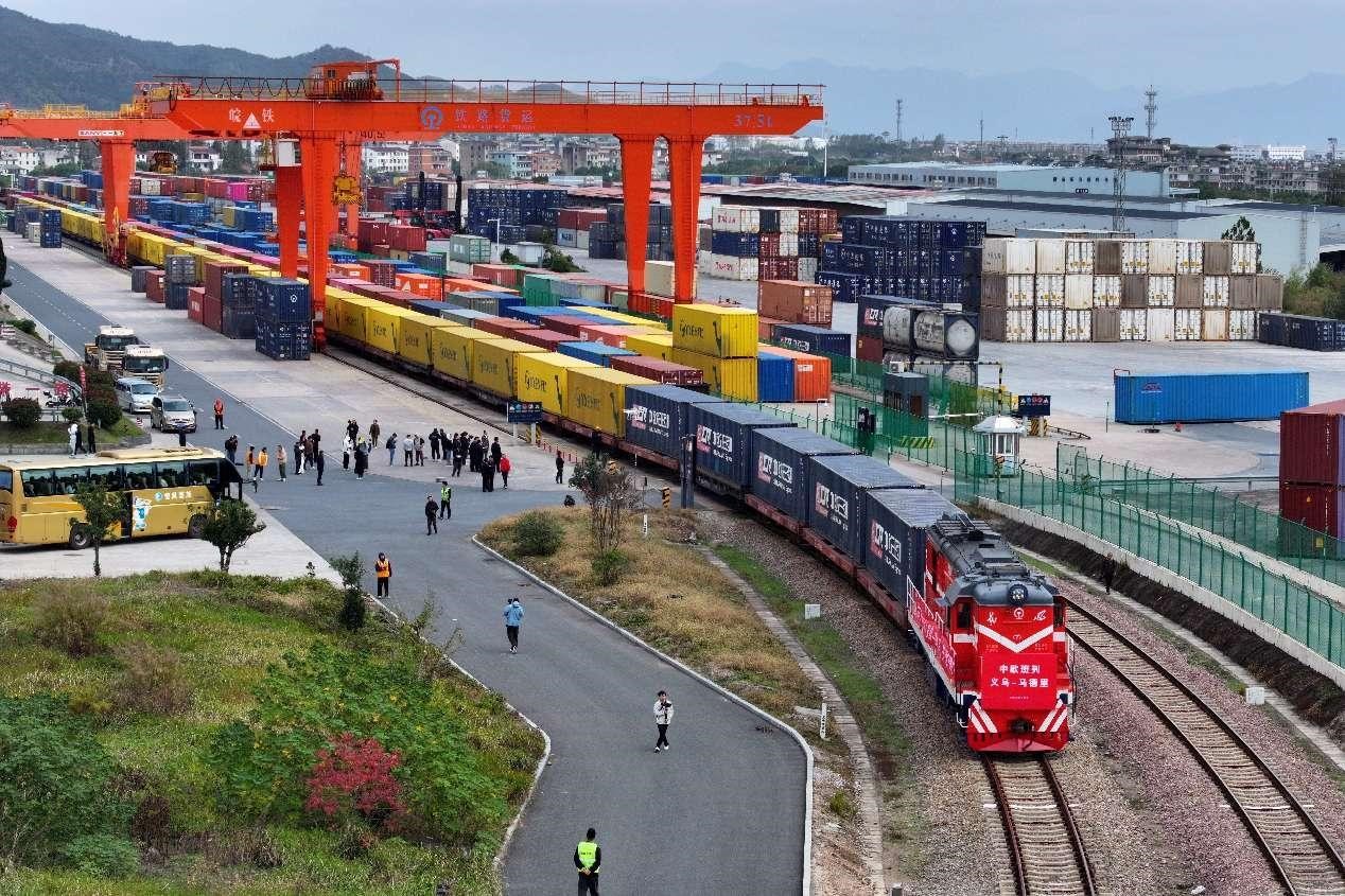 A fully loaded China-Europe freight train departs from Yiwu West Railway Station in Yiwu, east China's Zhejiang province, for Madrid, Spain, November 18, 2024. (People's Daily Online/Lyu Bin)