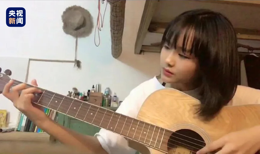 Liu Yaqing, a Chinese social media influencer known by her online aliases "Jiu Yue" and "Jiang Xunqian", plays the guitar. (Photo/CCTV News)