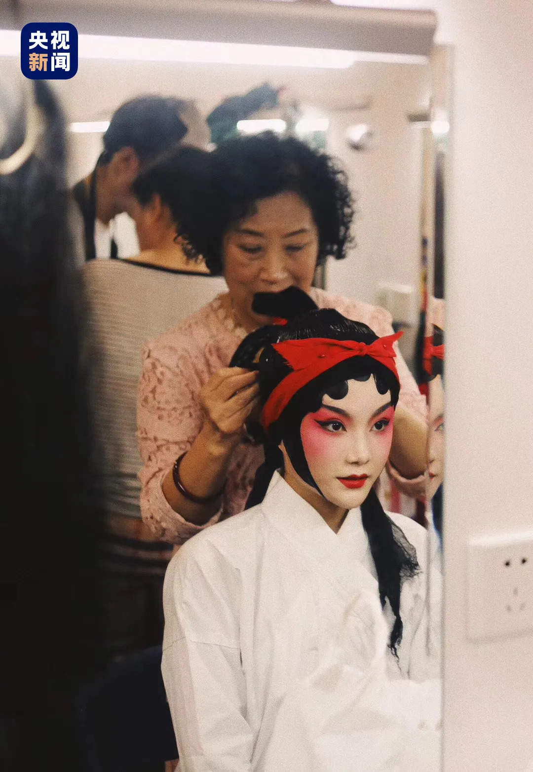Liu Yaqing, a Chinese social media influencer known by her online aliases "Jiu Yue" and "Jiang Xunqian", prepares for a Peking Opera performance in a video showcasing the traditional art form. (Photo/CCTV News)
