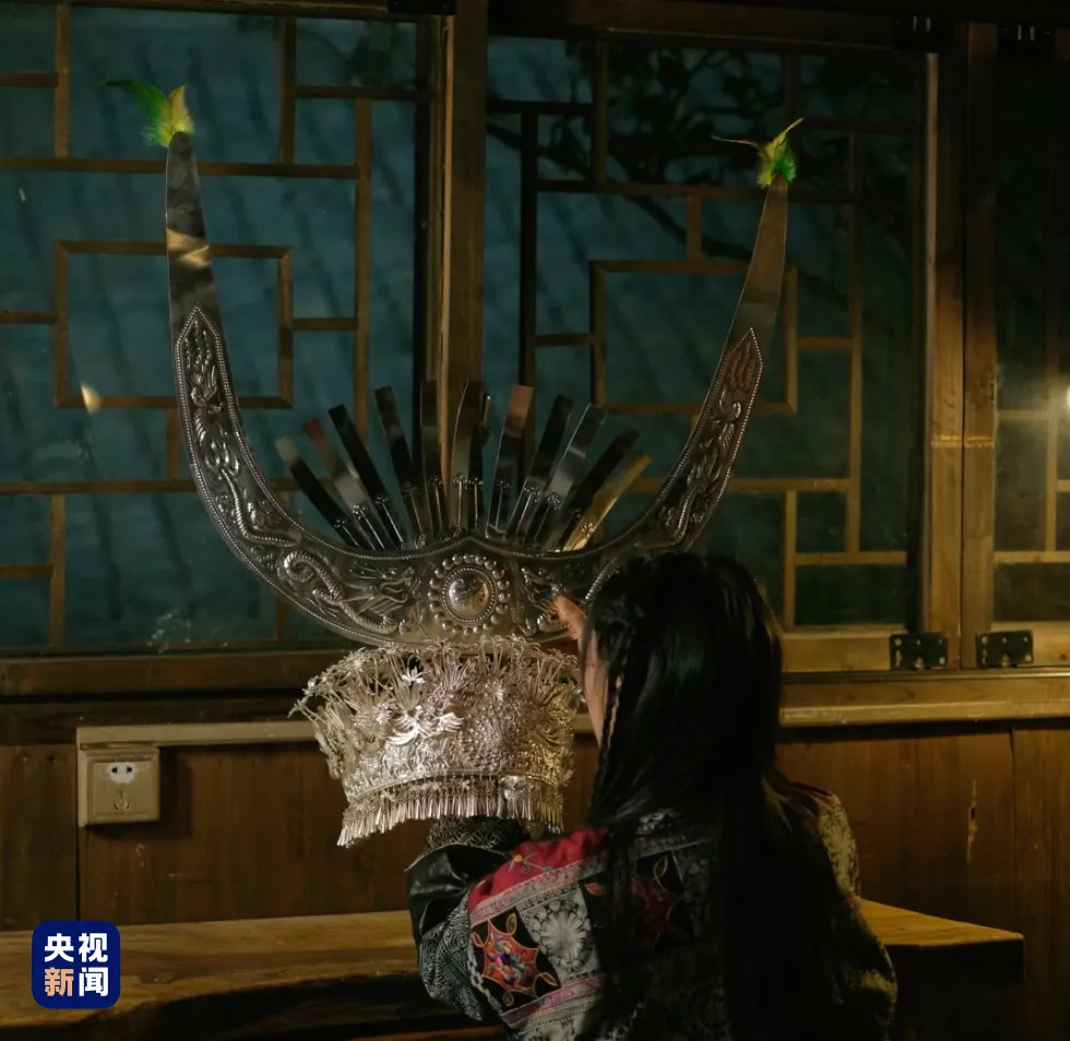 Liu Yaqing, a Chinese social media influencer known by her online aliases "Jiu Yue" and "Jiang Xunqian", makes a traditional silver headwear of the Miao ethnic group in a video showcasing the intangible cultural heritage of the Miao silver jewelry-making technique. (Photo/CCTV News)