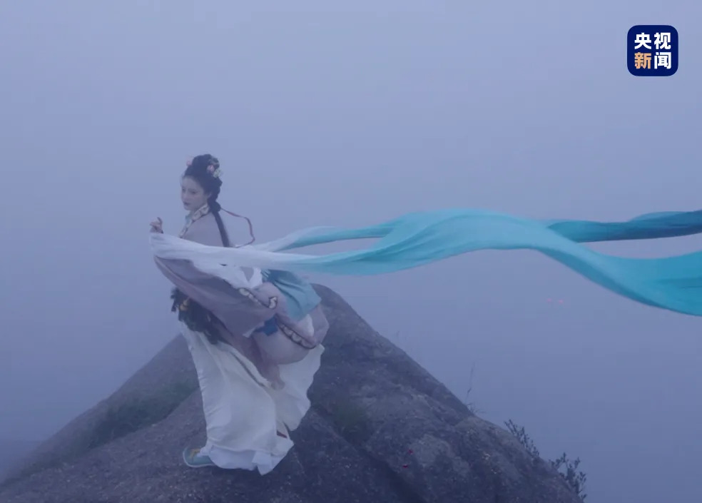 Liu Yaqing, a Chinese social media influencer known by her online aliases "Jiu Yue" and "Jiang Xunqian", imitates a goddess in a video showcasing intangible cultural heritage in China. (Photo/CCTV News)
