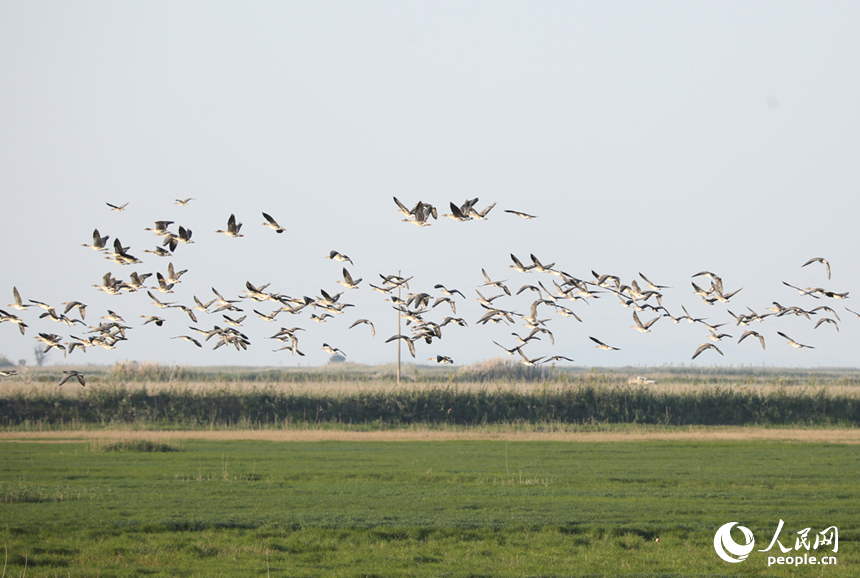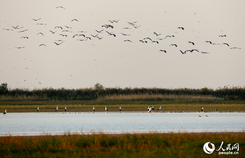 Photo shows large flocks of wintering migratory birds arriving at Poyang Lake, China's largest freshwater lake, as winter approaches. (People's Daily Online/Shi Yu)