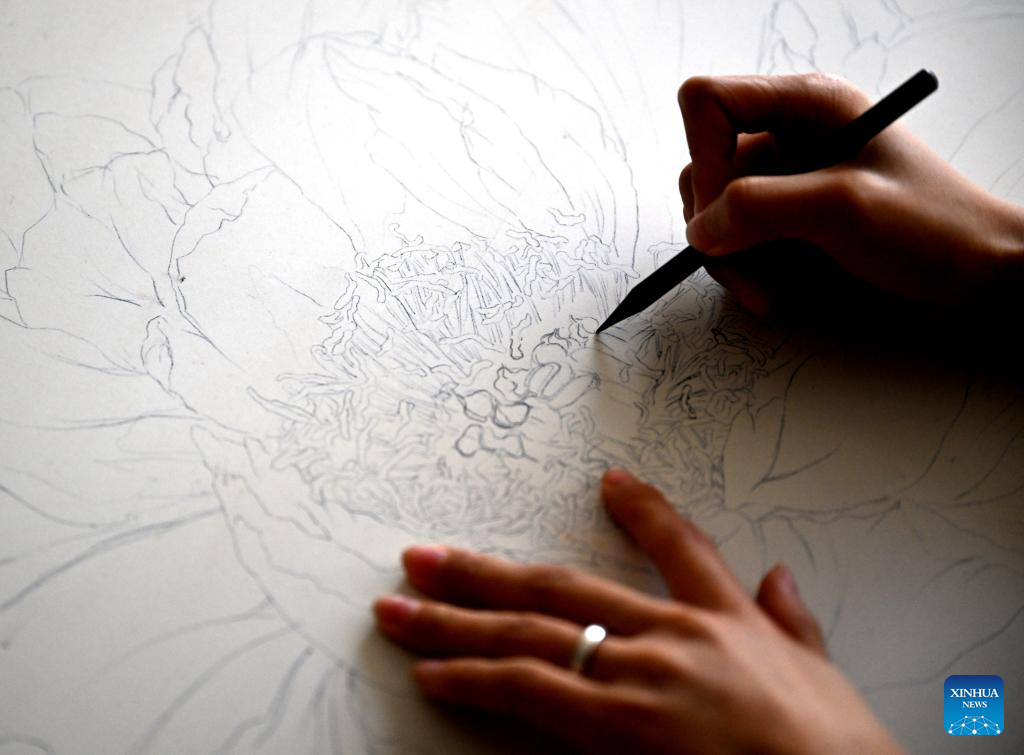 Cheng Guo makes a sketch of an artwork at her art ceramics studio in Luoyang, central China's Henan Province, Dec. 3, 2024. (Xinhua/Li Jianan)