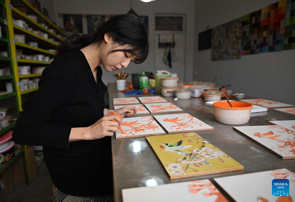 Cheng Guo makes a tri-colored glazed pottery printmaking artwork at her art ceramics studio in Luoyang, central China's Henan Province, Dec. 3, 2024. (Xinhua/Li Jianan)