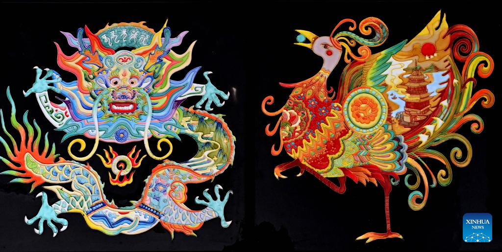 This photo taken on Dec. 3, 2024 shows two tri-colored glazed pottery printmaking artworks by Cheng Guo in Luoyang, central China's Henan Province. (Xinhua/Li Jianan)