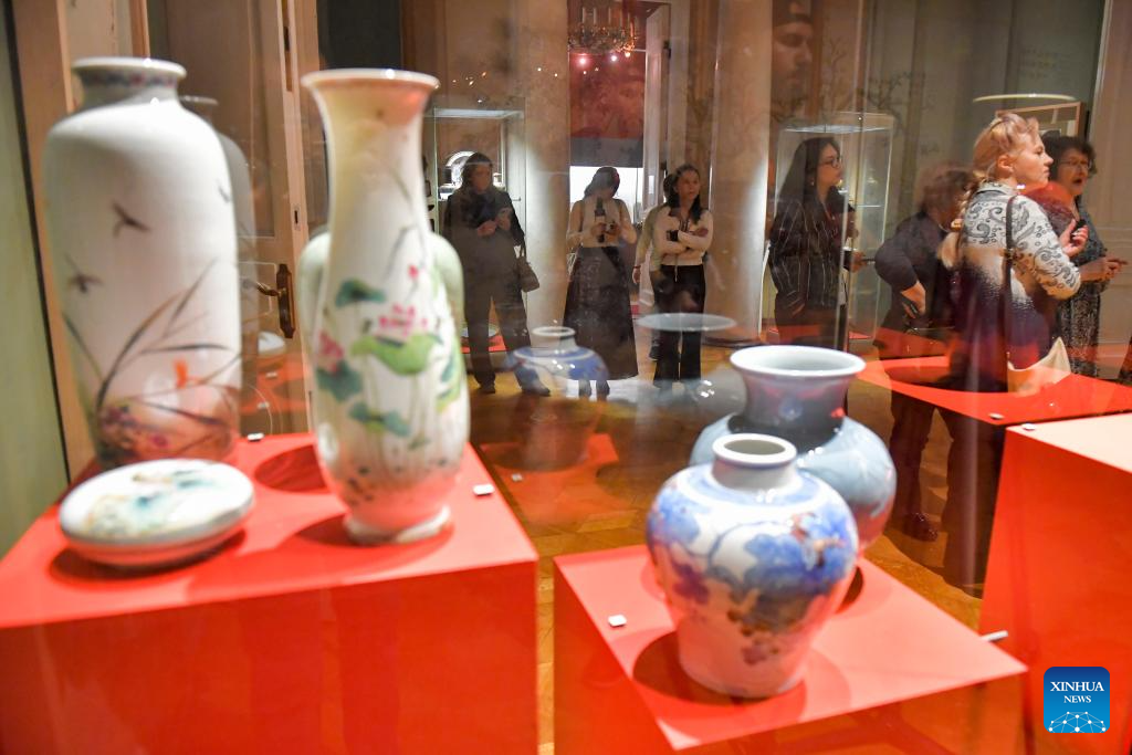Visitors take photos of exhibits at an exhibition of Chinese art at the State Museum of Oriental Art in Moscow, capital of Russia, on Dec. 4, 2024. (Photo by Alexander Zemlianichenko Jr/Xinhua)