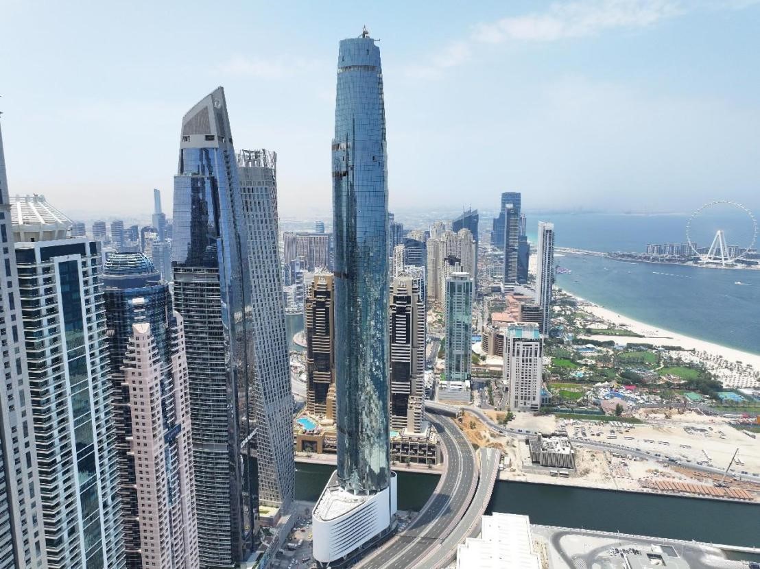 The hotel, situated in the vibrant Marina district of Dubai, stands at a towering height of 373.5 meters with a floor area of around 102,000 square meters. Its strategic location offers breathtaking views of iconic landmarks like the Burj Khalifa, the world's tallest building, Dubai Marina, and Palm Jumeirah. Upon completion, the hotel will provide 1,100 guest rooms, a rooftop swimming pool perched at 306 meters, a sky-high restaurant at 353 meters, and a sky garden.