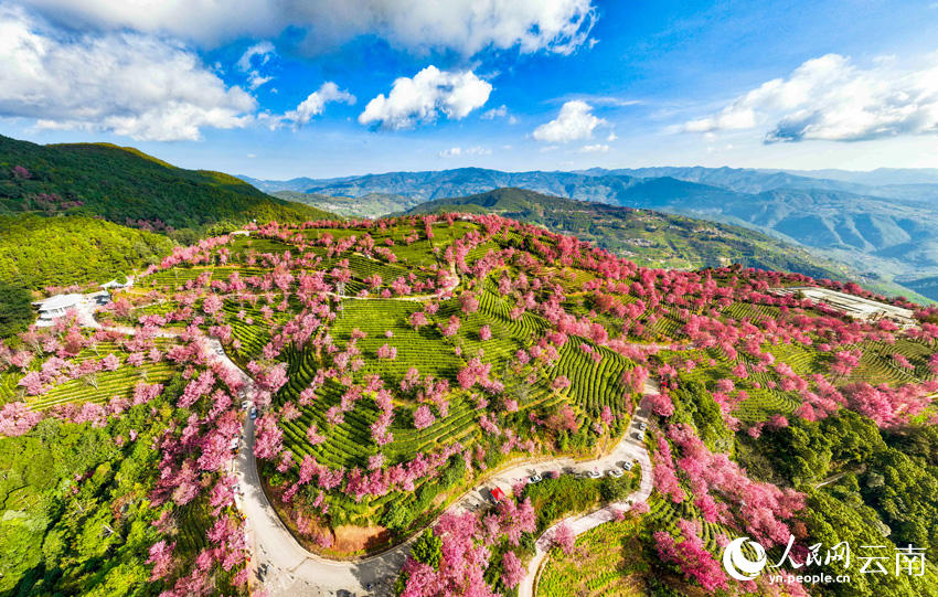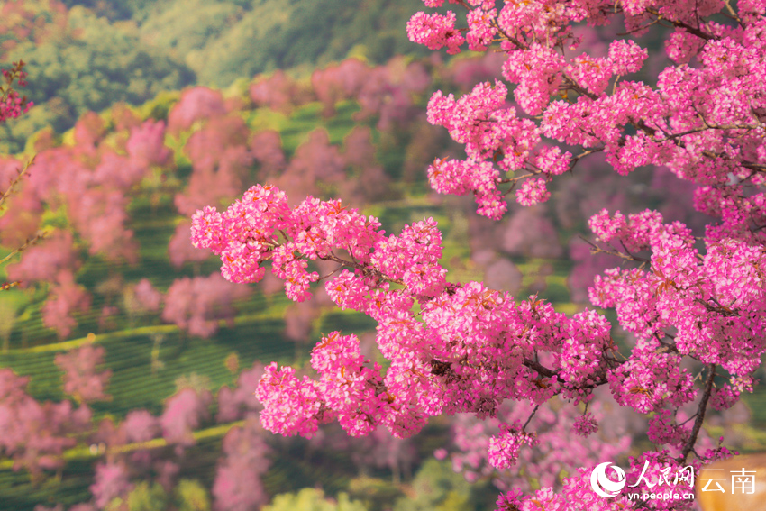 While snow blankets northern China, the Cherry Blossom Valley of Wuliang Mountain in Dali Bai Autonomous Prefecture, southwest China's Yunnan Province, is filled with spring-like vitality. Since the beginning of December, thousands of cherry trees nestled among the tea plantations have bloomed in succession. Around sunrise, the valley is shrouded in morning mist and resembles a fairyland.
