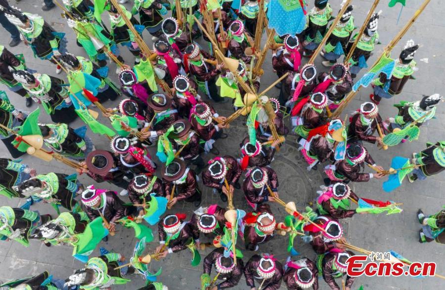 Wearing traditional ethnic dress, Miao villagers perform with lusheng reed pipes to celebrate the festival.