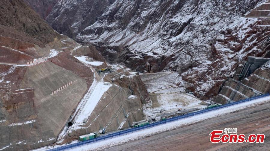 Aerial view of the construction site of the Dashixia Water Control Project in northwest China's Xinjiang Uygur Autonomous Region, Dec. 30, 2024. (China News Service/Wang Xiaojun)