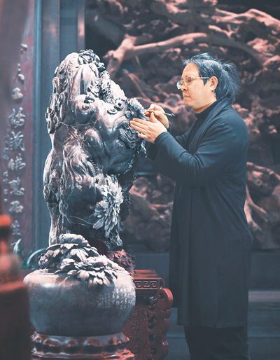 Photo shows a section of Chen Jiwu's chrysanthemum stone carving artwork inspired by Buddhism. (People's Daily Overseas Edition/Kang Pu)