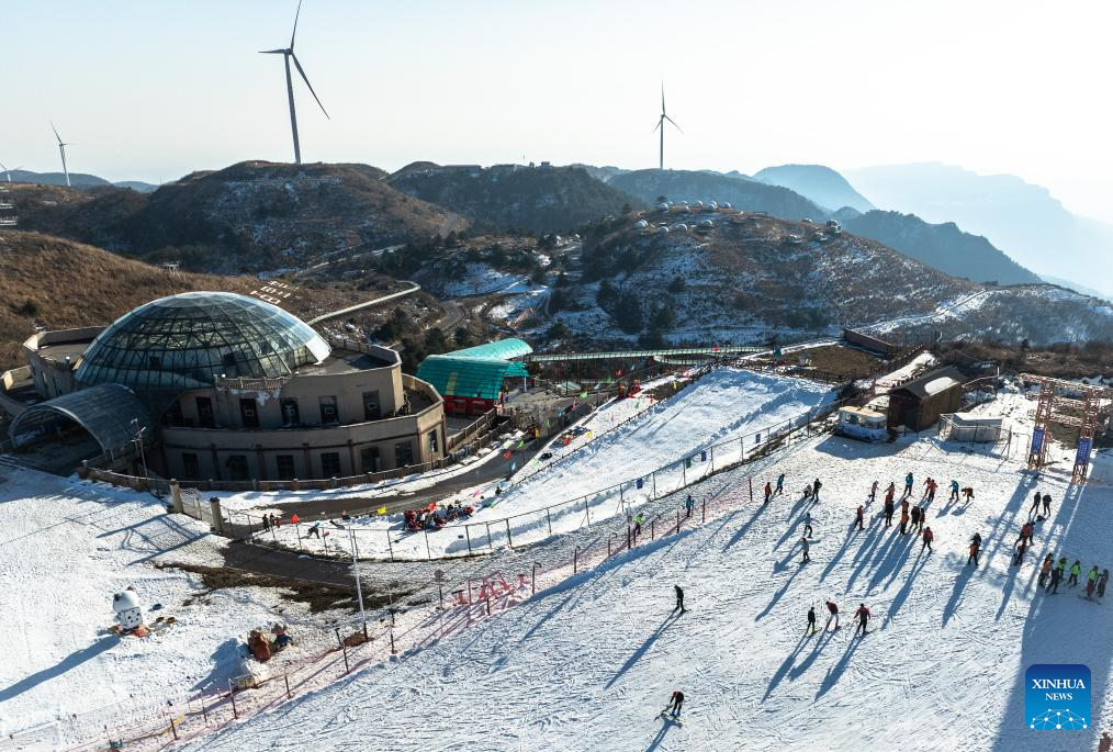 An aerial drone photo taken on Jan. 5, 2025 shows a view of Bailihuang Ski Resort in Yichang City, central China's Hubei Province. In recent years, Yichang has explored its ice and snow tourism resources, attracting numerous tourists. (Xinhua/Xiao Yijiu)