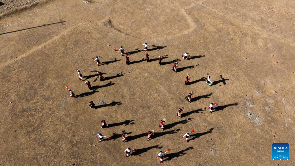 An aerial drone photo taken on Jan. 5, 2024 shows people performing Reba Dance in Chido Township, Dengqen County, Qamdo, southwest China's Xizang Autonomous Region. (Xinhua/Tenzin Nyida)