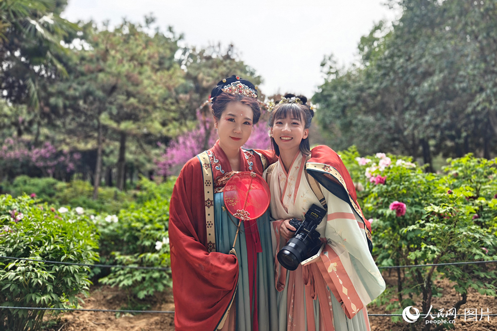 Visitors dressed in Hanfu, traditional costume of the Han ethnic group, pose for a photo in front of a sea of peonies at the 41st China Luoyang Peony Cultural Festival in Luoyang, central China's Henan Province, April 1, 2024. (People's Daily Online/Wang Yadie)