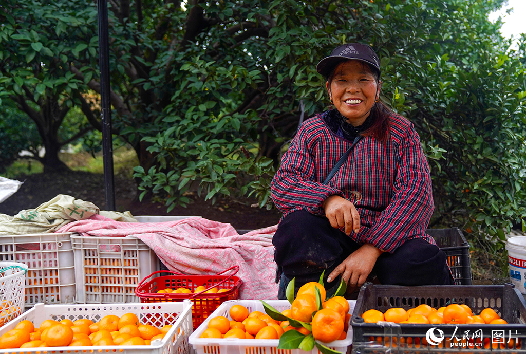 A citrus grower in Huangyan district, Taizhou city, east China's Zhejiang Province, smiles happily as her tangerines sell well, Dec. 7, 2024. (People's Daily Online/Guo Yang)