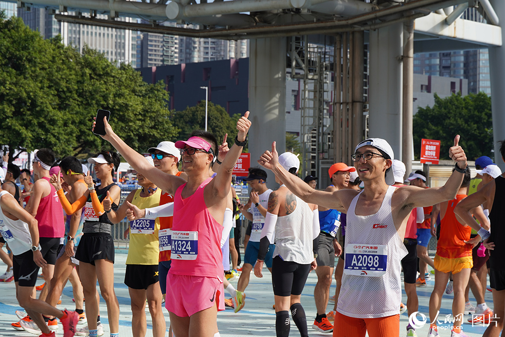 Participants smile and pose for a group photo after completing the 2024 Guangzhou Marathon in Guangzhou, south China's Guangdong Province, Dec. 8, 2024. (People's Daily Online/Wang Yadie)