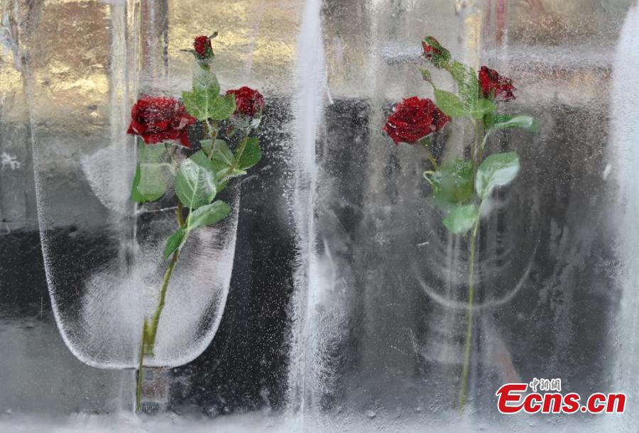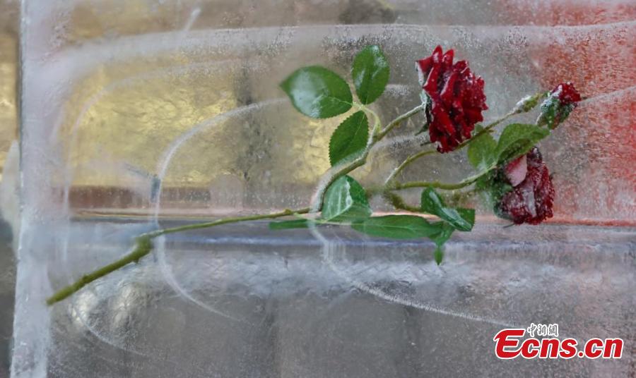 Bunches of red roses frozen in ice bricks attract many visitors to Shenyang, northeast China's Liaoning Province, Jan. 7, 2025. (China News Service/Yu Haiyang)