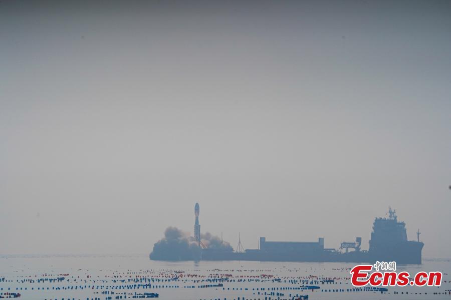 A Smart Dragon-3 rocket carrying the satellite group CentiSpace 01 blasts off from the sea near Haiyang City, east China's Shandong Province, Jan. 13, 2025. (China News Service/Xu Yajing)