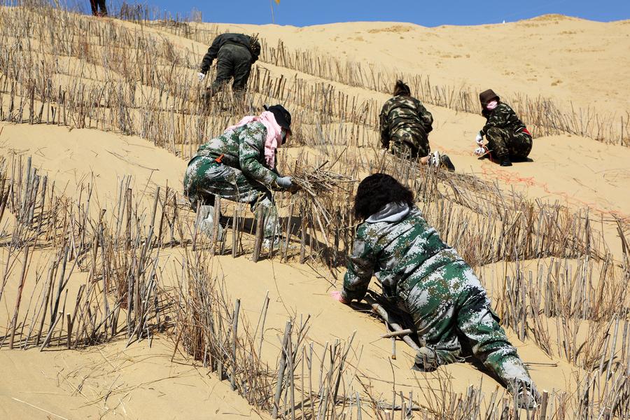 HOHHOT, Jan. 15 (Xinhua) -- In the freezing winter, on the fringes of the Kubuqi Desert in north China's Inner Mongolia Autonomous Region, dedicated sand control workers are busy mending and reinforcing defenses in the form of straw checkerboards -- featuring straw placed in a checkerboard pattern on the desert surface to secure dunes.