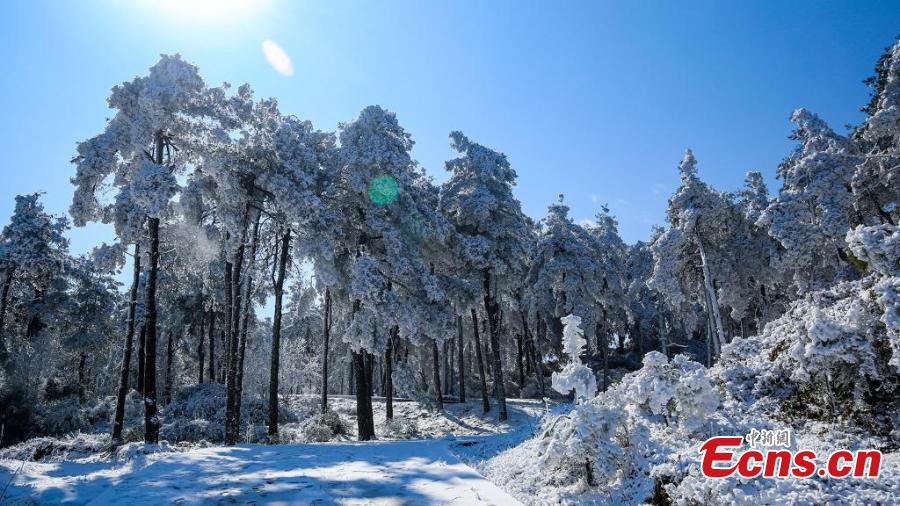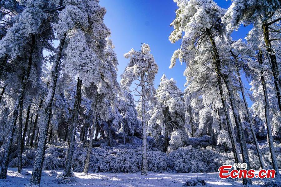 Yushe National Forest Park is turned to a white fairyland by snow and rime in Liupanshui, southwest China's Guizhou Province, Jan. 12, 2025. (Photo: China News Service/Zhao Hua)
