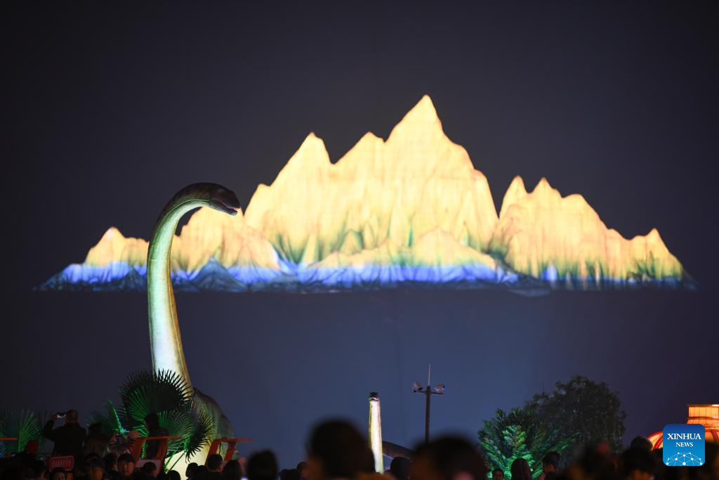 Lanterns are seen during the 31st Zigong International Dinosaur Lantern Show in Zigong, southwest China's Sichuan Province, Jan. 17, 2025. The 31st Zigong International Dinosaur Lantern Show kicked off here on Friday. This year's lantern show features 12 groups of super-large light sets, seven groups of large light sets and more than 200 groups of small and medium-sized light sets. The scale of the lantern displays has set a new record in the history of the Zigong International Dinosaur Lantern Show. (Xinhua/Xu Bingjie)