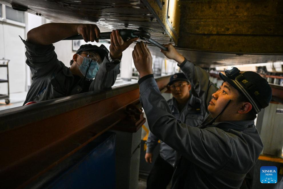 A technician inspects a bullet train at a train depot in Hohhot, north China's Inner Mongolia Autonomous Region, Jan. 17, 2025.