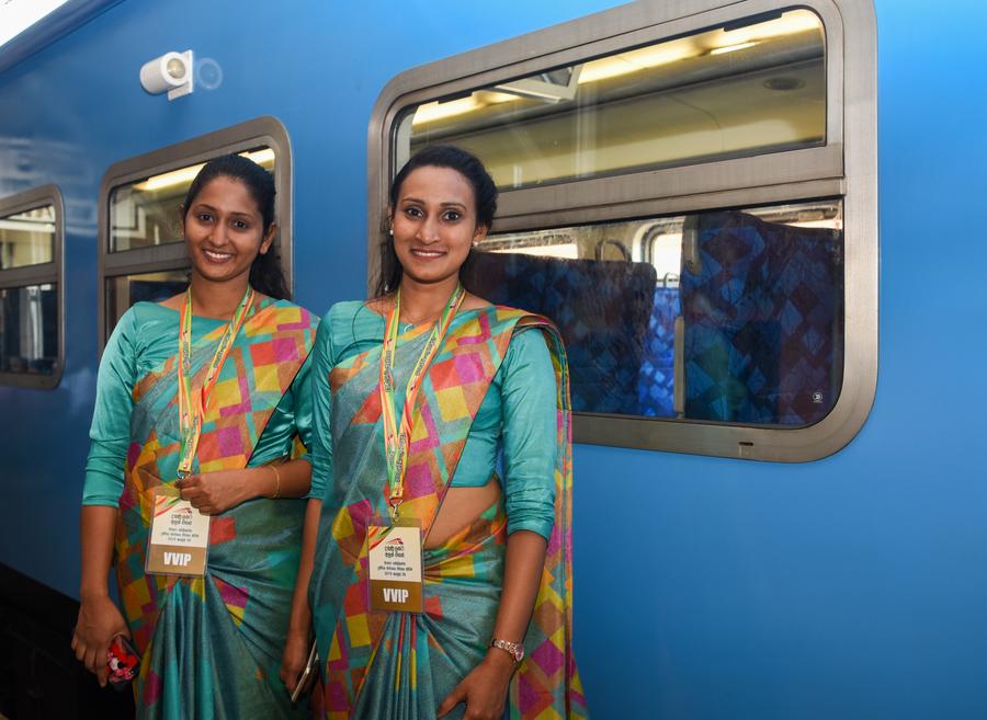 Women in traditional costumes wait to experience the Matara-Beliatta railway line at the Matara Railway Station in Sri Lanka, April 8, 2019. (Xinhua/Guo Lei)