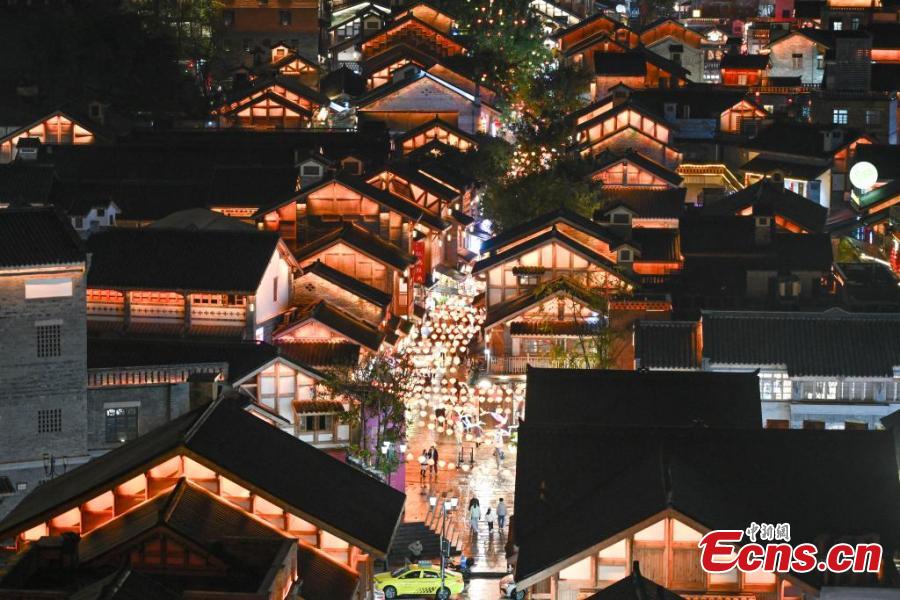 Tourists enjoy lanterns at the 18 Steps, a well-known popular tourist spot that features a blend of ancient architecture and modern retail spaces, in Chongqing, Jan. 25, 2025. (China News Service/He Penglei)
