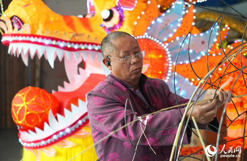Shi Kebin, a representative inheritor of the provincial intangible cultural heritage of Chengnan Dragon Lantern, makes a dragon lantern in Qingyunpu district, Nanchang, capital city of east China's Jiangxi Province. (Photo/Shi Kejiang)