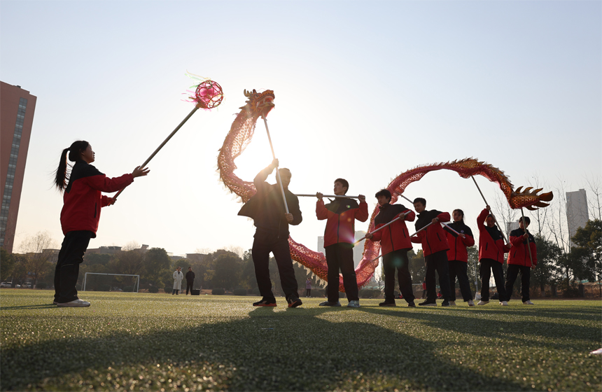 Shi Kebin teaches students dragon dance in a school in Qingyunpu district, Nanchang, capital city of east China's Jiangxi Province. (Photo/Wang Yunrong)