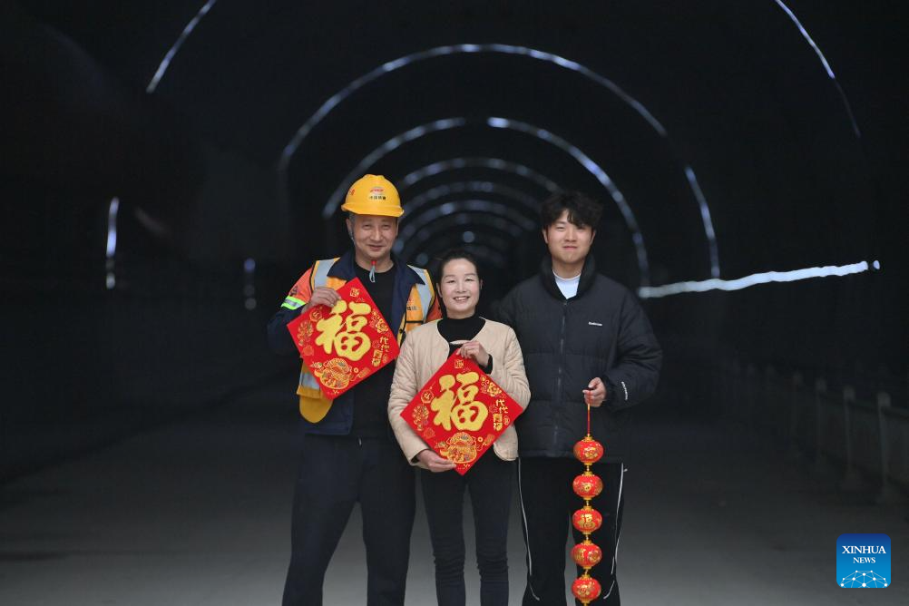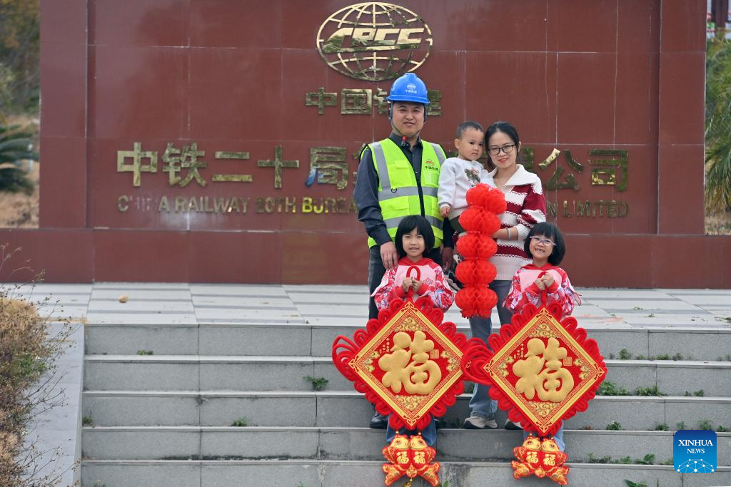 Workers and their family members are pictured at the construction site of an expressway linking Yufeng and Yizhou of south China's Guangxi Zhuang Autonomous Region in Liuzhou of Guangxi, Jan. 22, 2025.