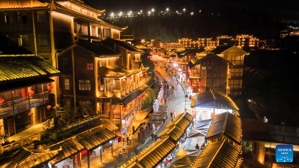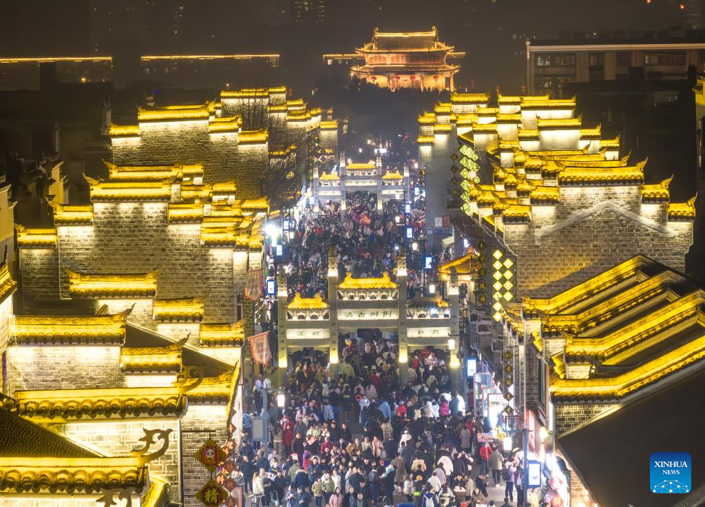An aerial drone photo shows people visiting Xiangdong Street of Xinhua County, Loudi City, central China's Hunan Province, Jan. 30, 2025. People enjoy various activities to celebrate the Chinese New Year which falls on Jan. 29 this year. (Xinhua/Chen Zhenhai)