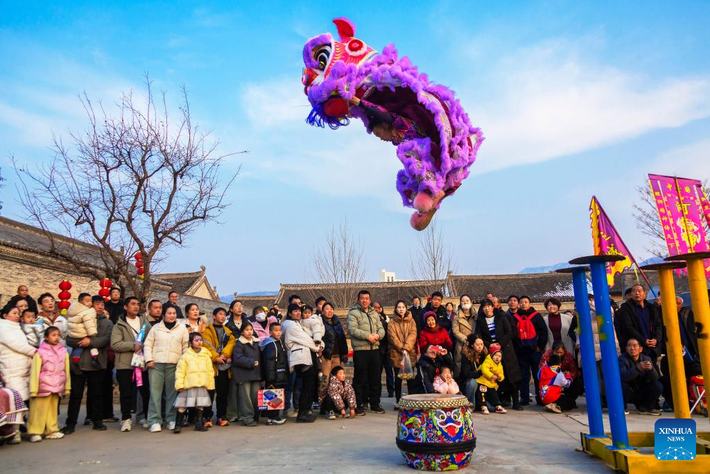 People enjoy a lion dance at Lanshangen scenic spot in Yanhu District, Yuncheng City, north China's Shanxi Province, Jan. 30, 2025. People enjoy various activities to celebrate the Chinese New Year which falls on Jan. 29 this year. (Photo by Jiang Hua/Xinhua)