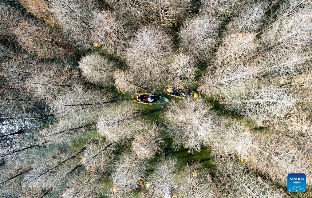 People row among trees at Haihong Wetland Park in Kunming, southwest China's Yunnan Province on Jan. 31, 2025. People enjoy various activities to celebrate the Chinese New Year which falls on Jan. 29 this year. (Xinhua/Chen Xinbo)