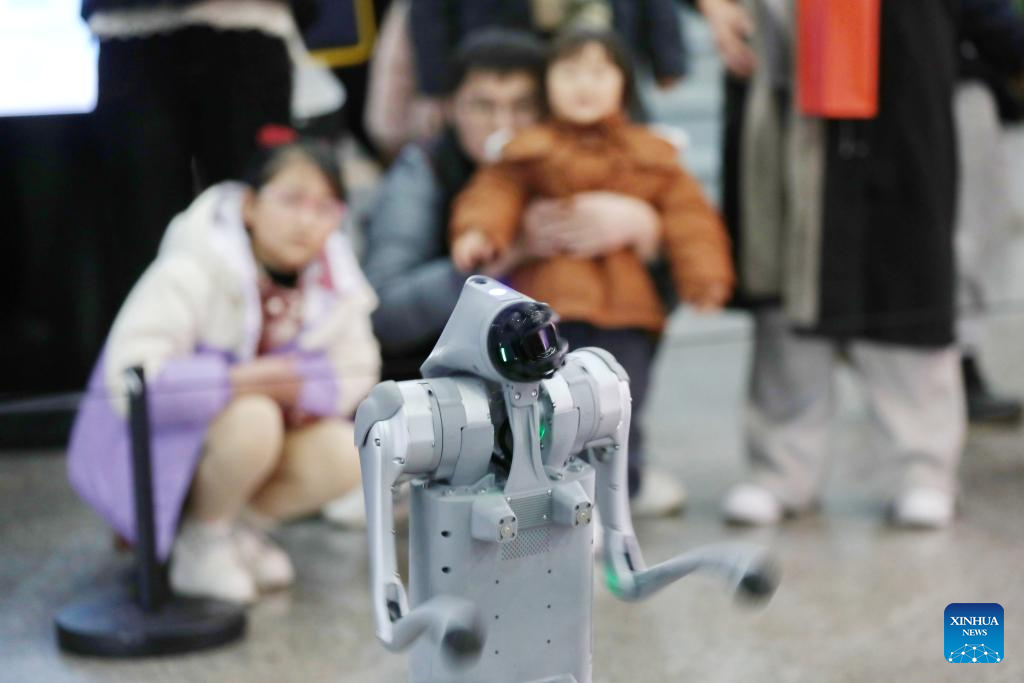 Visitors watch a performance made by a robot dog at the science and technology museum in Jiaxing City, east China's Zhejiang Province, Jan. 31, 2025. People enjoy various activities to celebrate the Chinese New Year which falls on Jan. 29 this year. (Photo by Jin Peng/Xinhua)