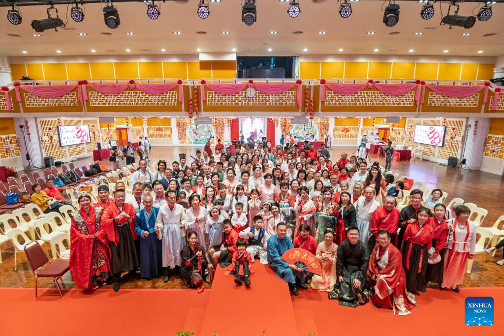Hanfu lovers pose for a group photo during a Hanfu-themed gathering in Kuala Lumpur, Malaysia, Feb. 2, 2025. A Hanfu-themed gathering in celebration of the Chinese Lunar New Year, or the Spring Festival, was held here on Sunday. (Photo by Chong Voon Chung/Xinhua)