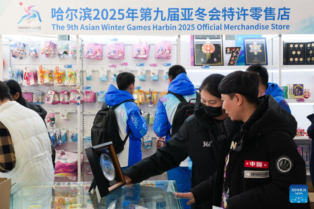 Customers select souvenirs at an official merchandise store in the main press center in the Main Media Center (MMC) of the 2025 Asian Winter Games in Harbin, northeast China's Heilongjiang Province, Feb. 5, 2025. (Xinhua/Zheng Huansong)